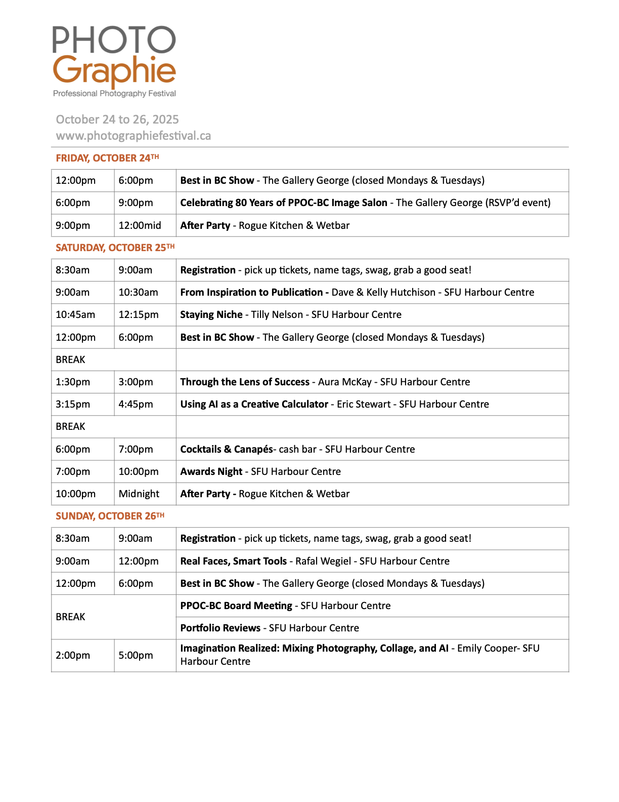 Come celebrate the Best in Class and other special awards from the PPOC-BC Image Competition. Get dressed up, cheer on your fellow photographers, and maybe bring home a trophy! Also returning this year will be our awards portrait studio.